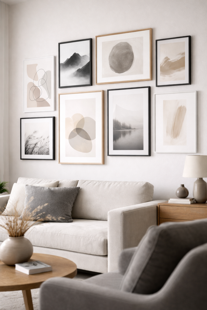 Klasyczne i nowoczesne ramki do salonu, które podkreślają charakter wnętrza i nie dominują nad obrazem. Najczęściej wybierane są proste profile w kolorze czarnym, białym lub naturalnego drewna.