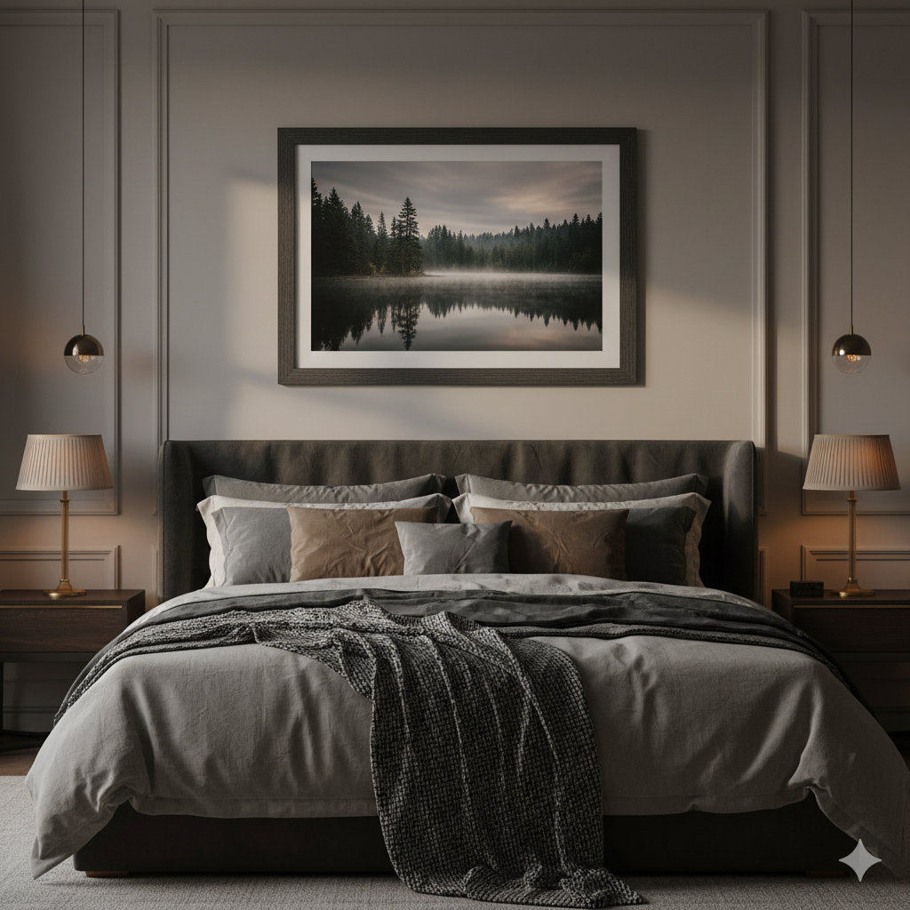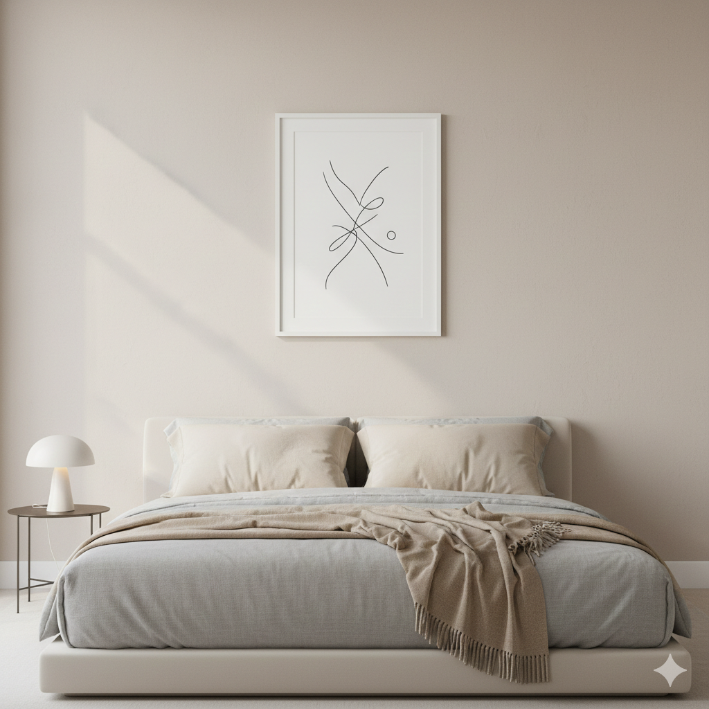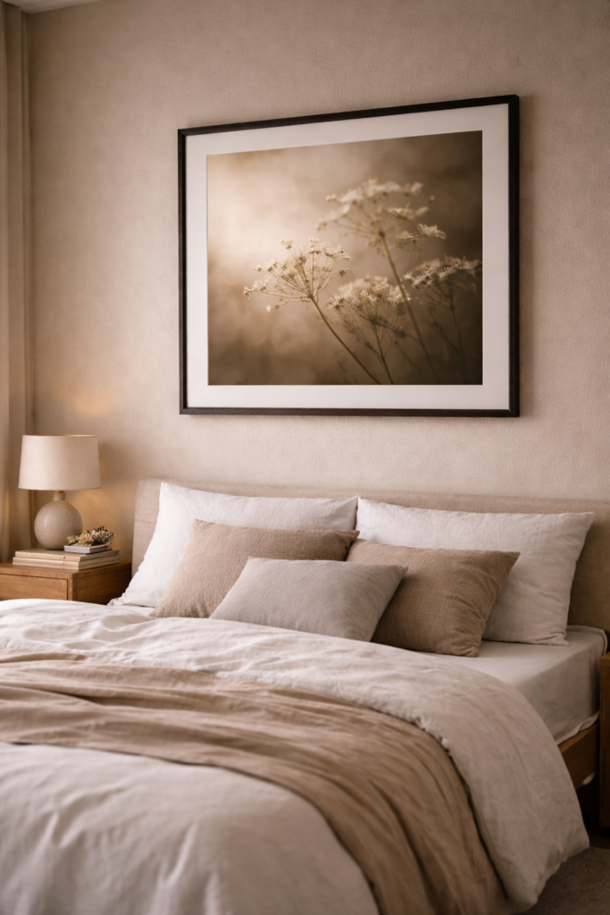 W sypialniach najlepiej sprawdzają się stonowane ramki – jasne drewno, biel lub cienkie profile. Oprawa powinna tworzyć spokojną, harmonijną całość.